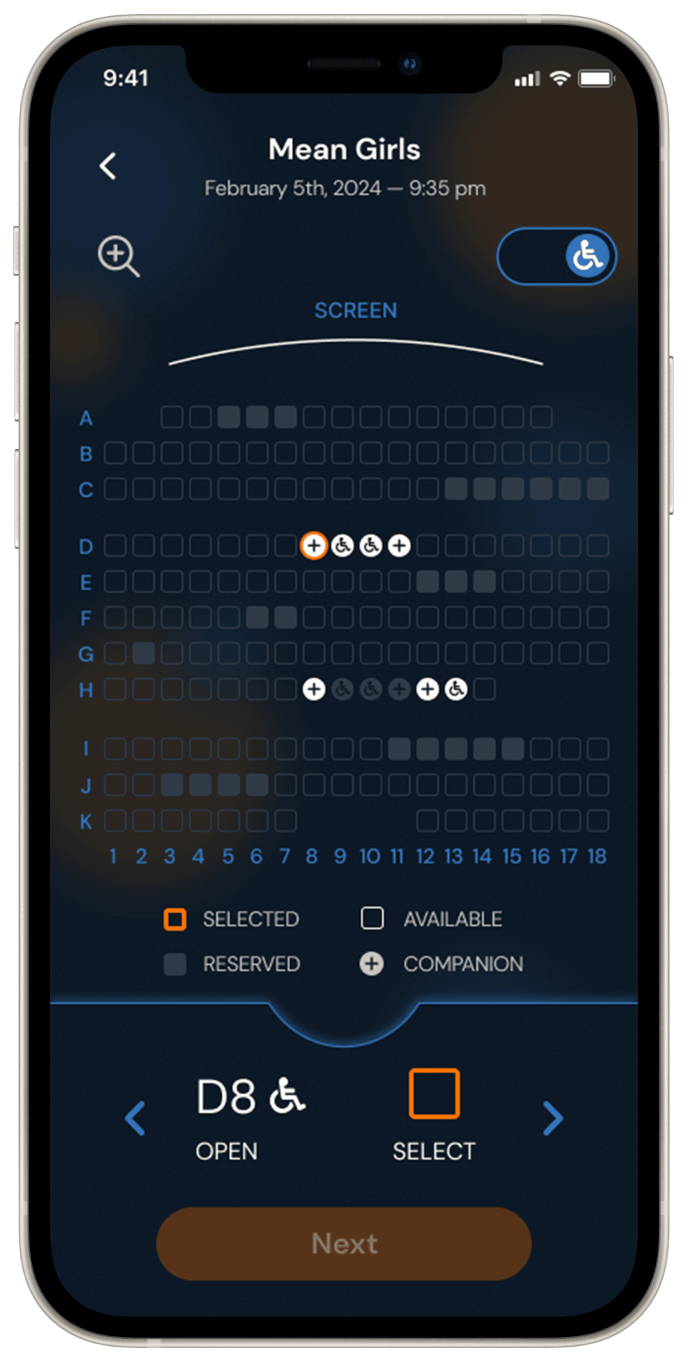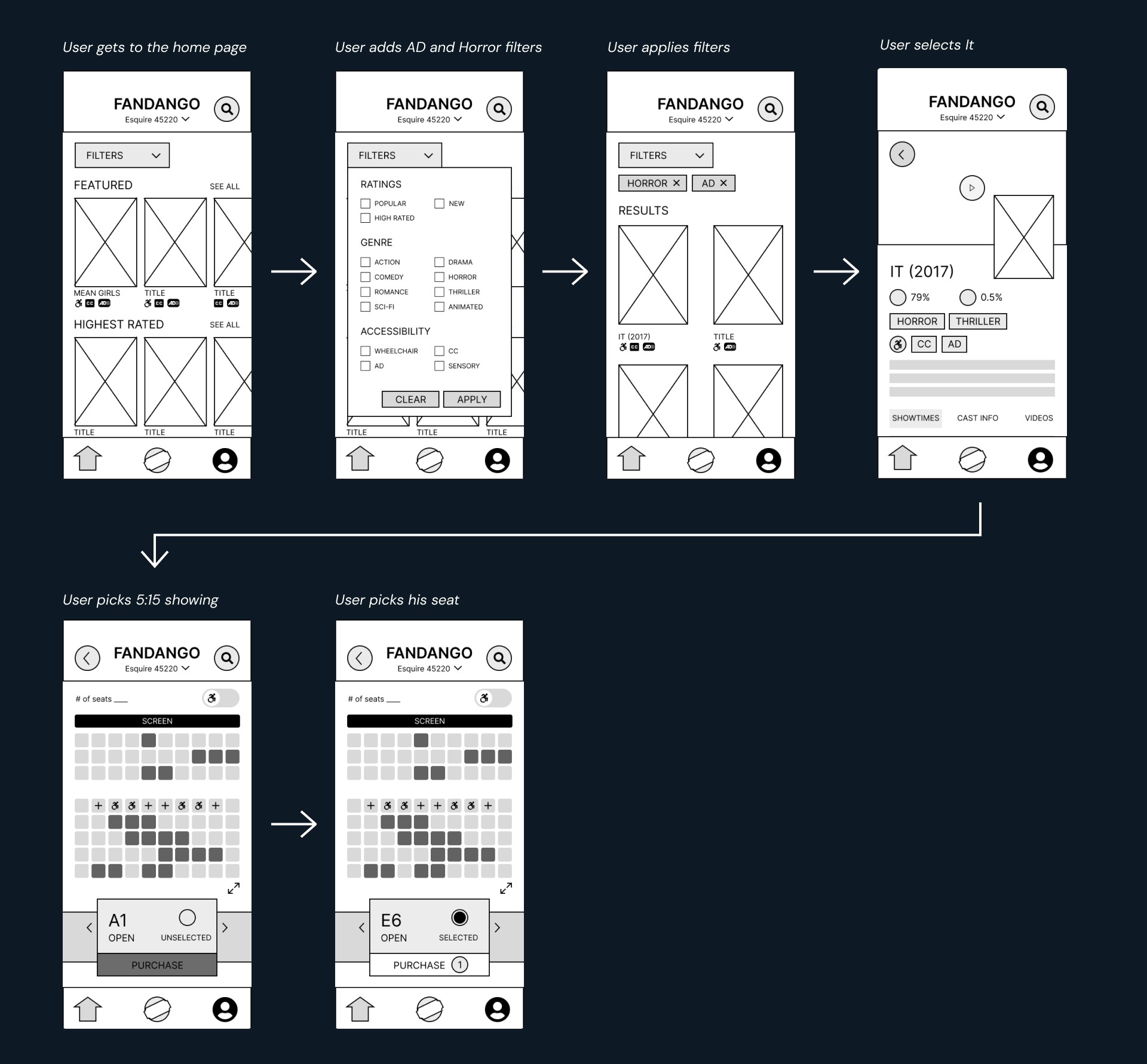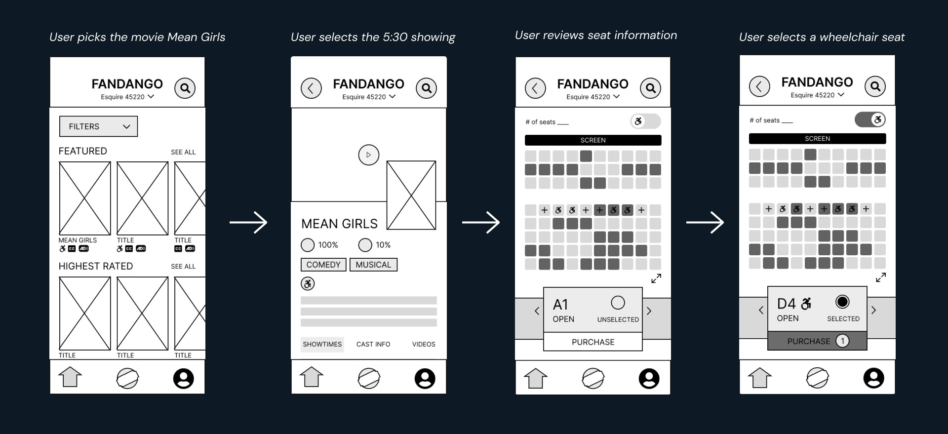 How a user who need wheelchair accessible theaters navigates the new Fandango app.