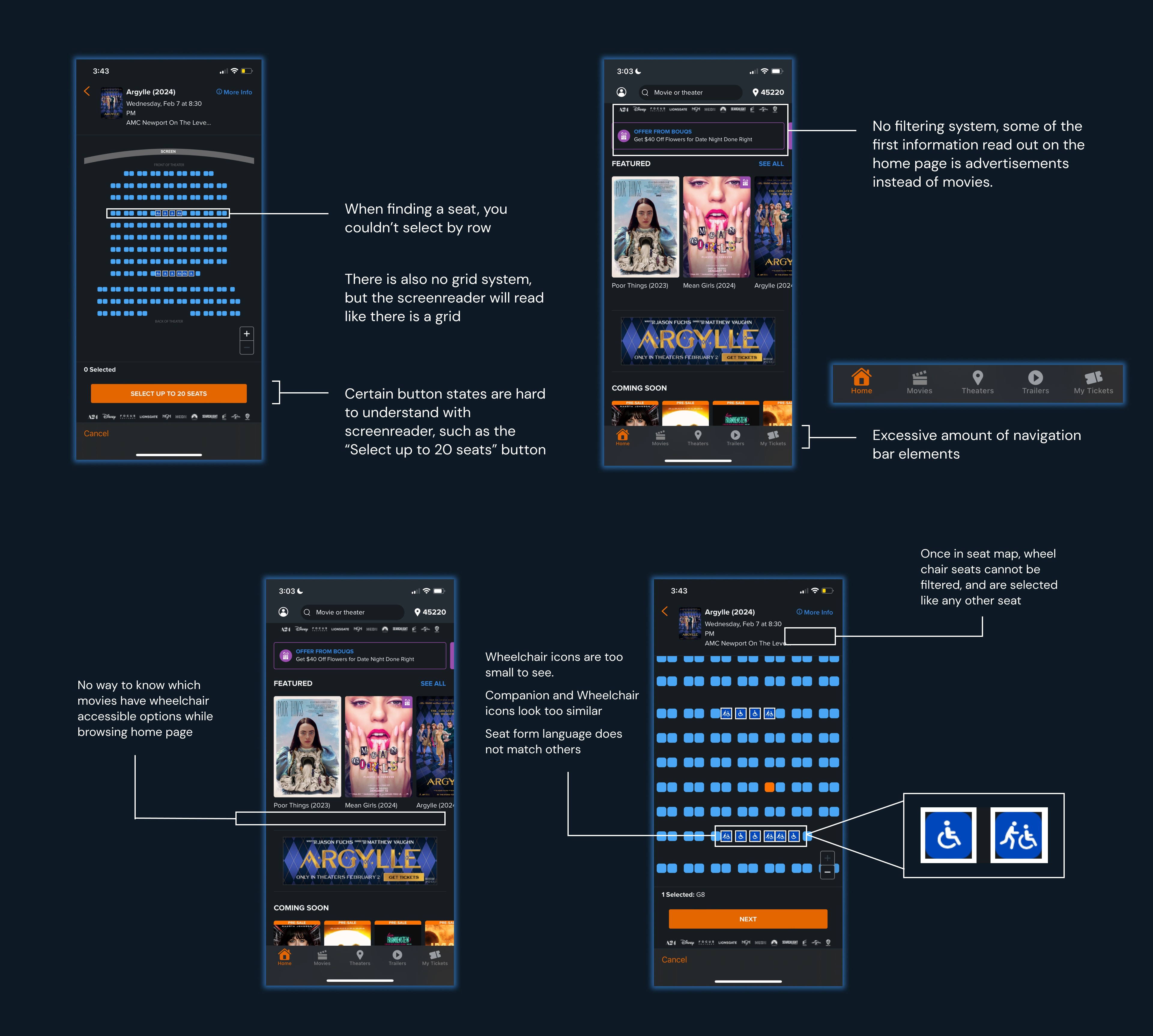Doing preliminary research, including testing screen readers, many apps struggle with accessibility considerations. Fandango, a movie browsing and theater booking app struggles with screen reader implementation, along with advanced filtering for the physically impaired. How can we make the Fandango app more usable for disabled users?